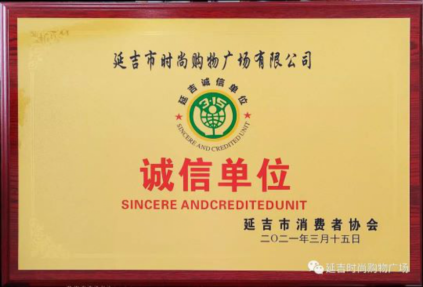 正值315消费者权益日之际,在我市开展的“州暨延吉市纪念“3.15”国际消费者权益日宣传咨询服务活动”中,延吉市时尚购物广场有限公司荣获由延吉市消费者协会颁发的“诚信单位”荣誉称号。