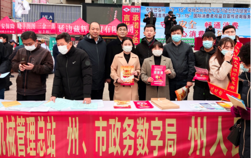 3月15日上午,在州暨延吉市市监局组织开展的以“守护安全,畅通消费”为主题,纪念“3·15”国际消费者权益日宣传咨询服务活动中,州暨延吉市政数局利用这个契机,开展社会信用体系建设宣传。