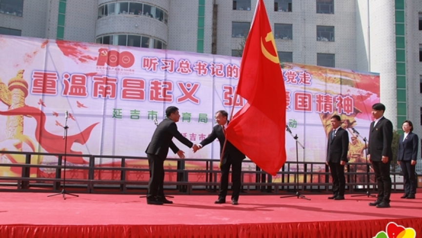当日8时40分,鲜红的党旗在延吉市第二高中护旗队的护送下来到第三高级中学。伴随着全体师生齐唱的《国歌》,党旗传递活动正式开始。第三高级中学党总支书记、校长裴玉良从延吉市第二高中党总支副书记李柱范手中接过了党旗。李柱范介绍了本校党旗传递活动的开展情况,第三高中党总支副书记张魁丰做动员讲话,第三高中学生代表进行了发言,市教育局相关负责人对党旗传递活动提出了具体要求。