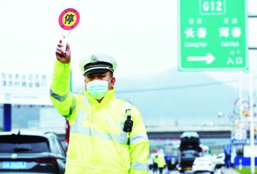 “五一”期间,延吉市公安局加强道路交通车辆管理,对超重、超载以及违规上道车辆进行严格检查,营造安全出行的道路交通环境。图为在延吉市高速北出口,延吉市公安局交警大队依兰中队辅警魏全新开展执勤工作。