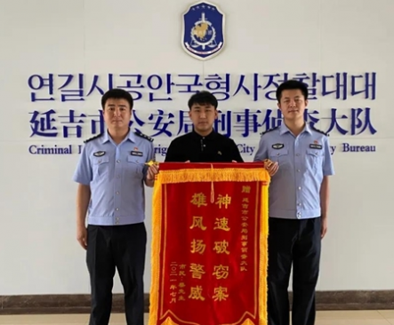 近日,延吉市公安局成功破获一起盗窃机动车案件,抓获犯罪嫌疑人赵某某。7月5日,被盗机动车车主蔡先生来到延吉市公安局,向快速侦破案件的刑警大队侦查员赠送了写有“神速破窃案 雄风扬警威”的锦旗表示感谢。