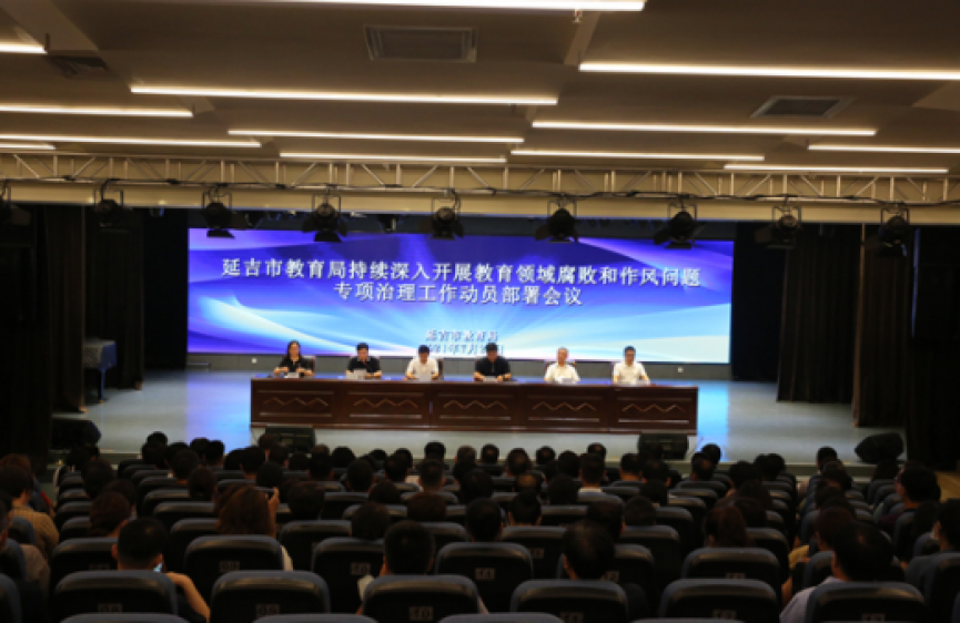 会上,传达了州、市纪委关于持续深入开展教育领域腐败和作风问题专项治理工作精神,宣读了《关于教育领域腐败和作风问题专项治理工作中的典型案例的通报》,下发了《延吉市教育局关于持续深入开展教育领域腐败和作风问题专项治理工作方案》。市纪委常委姚化礼对本次专项治理工作提出了具体工作要求。各中小学、幼儿园、直属事业单位主要负责人签订并递交了专项治理责任书。市教育局党组书记、局长赵文秀做了动员讲话。