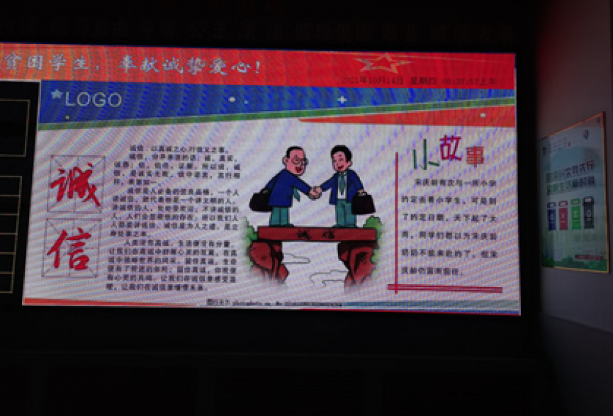 “诚信是人生的命脉”。为培养学生诚信的优良品质,增强学生的诚信意识,学校以班级为单位组织学生观看诚实守信的宣传片,宣传诚信思想。校园电子显示屏滚动播放关于诚信的宣传图片,如“商鞅立木”、“韩信报恩”等诚信故事图片以及“言必信,行必果”等关于诚实守信的名言警句,宣传诚信文化,营造人人讲诚信的浓郁氛围。