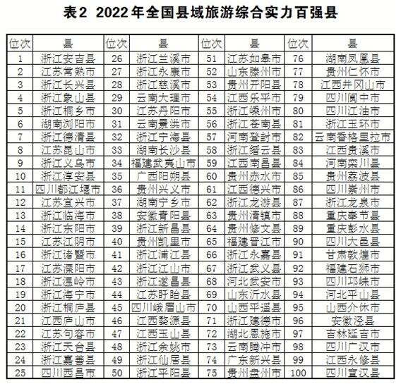据了解,2022年全国县域旅游研究对象为内地1866个县(含县级市、自治县、旗、自治旗、特区、林区)。县域旅游综合实力研究从旅游经济发展水平、政府推动作用、旅游产业综合带动功能、旅游开发与环境保护、旅游设施与服务功能、旅游质量监督与市场监管6个方面35个指标构建研究体系,得分居前100位的即为2022年全国县域旅游综合实力百强县。
