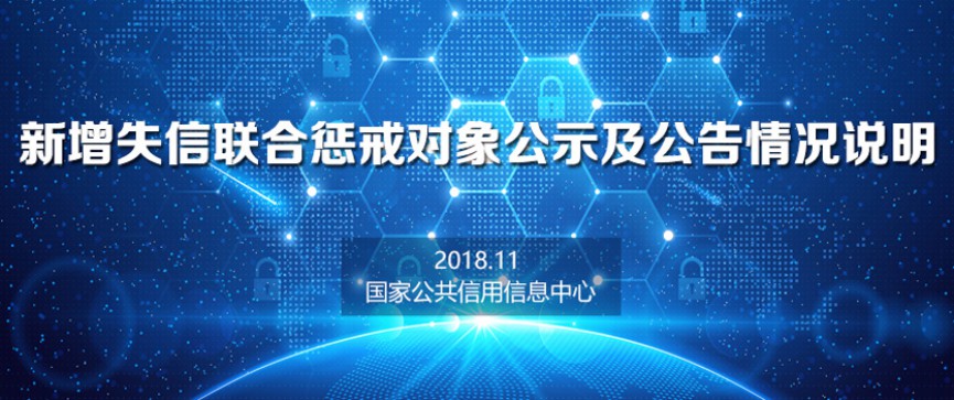 为构建“一处失信,处处受限”的联合惩戒格局,深入推进社会信用体系建设,根据《国务院关于建立完善守信联合激励和失信联合惩戒制度加快推进社会诚信建设的指导意见》(国发〔2016〕33号)、《国家发展改革委人民银行关于加强和规范守信联合激励和失信联合惩戒对象名单管理工作的指导意见》(发改财金规〔2017〕1798号)以及各部委联合签署的备忘录,现就11月新增失信联合惩戒对象信息公示及公告事宜说明如下: