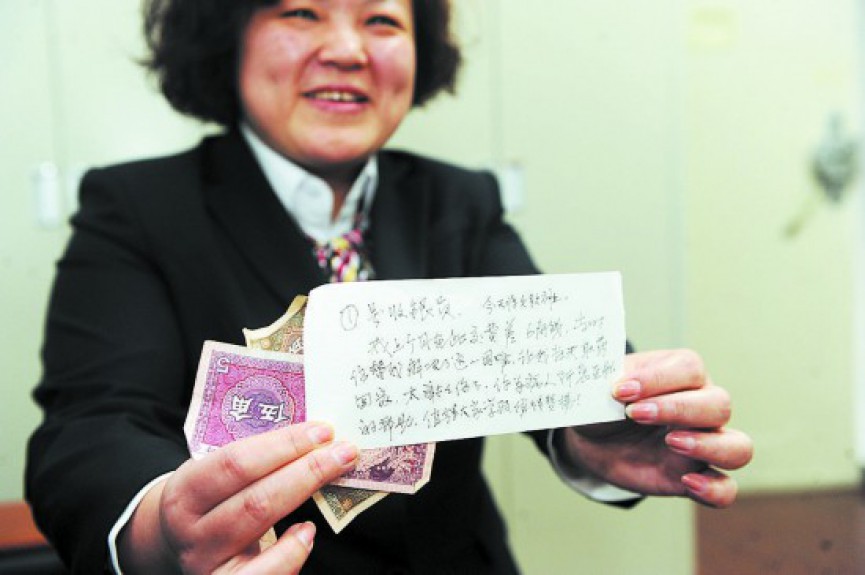 申秋菊将6角钱和“感谢信”转交给了收费处组长李林峰,李林峰又将其交到了孔蕾的手中。