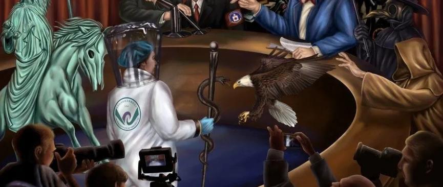 漫画以美国国会听证会为场景,右上方一幅名为“被审判的伽利略”的油画以及画面下方伽利略的一句拉丁文名言“Eppur si muove”(意为“地球仍然在转啊”),都点明了这幅漫画的主题——美国政府对科学精神的打压,正如欧洲宗教裁判所对伽利略的审判一样荒谬可笑。正在受审的是一名象征着科学精神的武汉病毒研究所的科研人员。审判席上从左到右,分别坐着历史上反科学、反理性的臭名昭著的人物形象。画面左边竖立的是自由女神像与天启死亡骑士的混合体,右边则是象征美国政府的白头海雕,正扑向受审者手中的蛇形手杖。