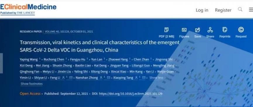 广州医科大学附属市八医院唐小平、李锋教授团队联合广州医科大学附属第一医院广州呼吸健康研究院钟南山院士、陈如冲教授团队,针对德尔塔变异株引起的“5·21新冠肺炎疫情”,结合流行病学和病毒基因组测序技术首次在全球范围内精确描绘了德尔塔变异株传播的完整传播链,并结合临床资源,多方位描绘了该起疫情中病例的临床特征及病毒动力学特点。近日,该项研究成果在国际权威期刊《柳叶刀》子刊《电子临床医学杂志》上发表。