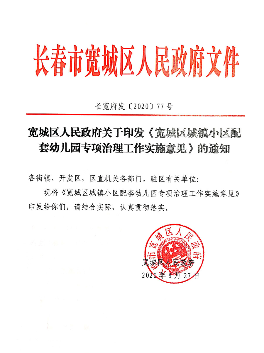关于印发《宽城区城镇小区配套幼儿园专项治理工作实施意见》的通知